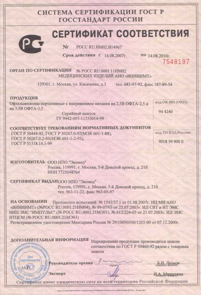 | Офтальмоскоп портативный  ОФТА-2,5/3,5, ОФТАп-2,5/3,5 ОФТАд-2,5/3,5, ОФТАш серии "Быстрый ответ" Патент № 3083 от 21.06.95 г. Регистрационное удостоверение № 29/10050500/1205-00 Сертификат соответствия № РОСС RU.ИМ02.В14967   |